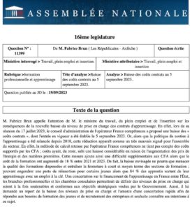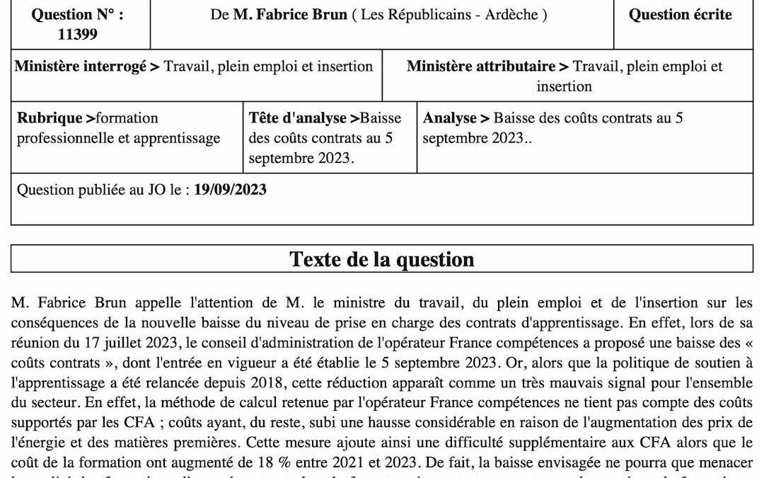 Question au Gouvernement sur la nouvelle baisse du niveau de prise en charge des contrats d’apprentissage