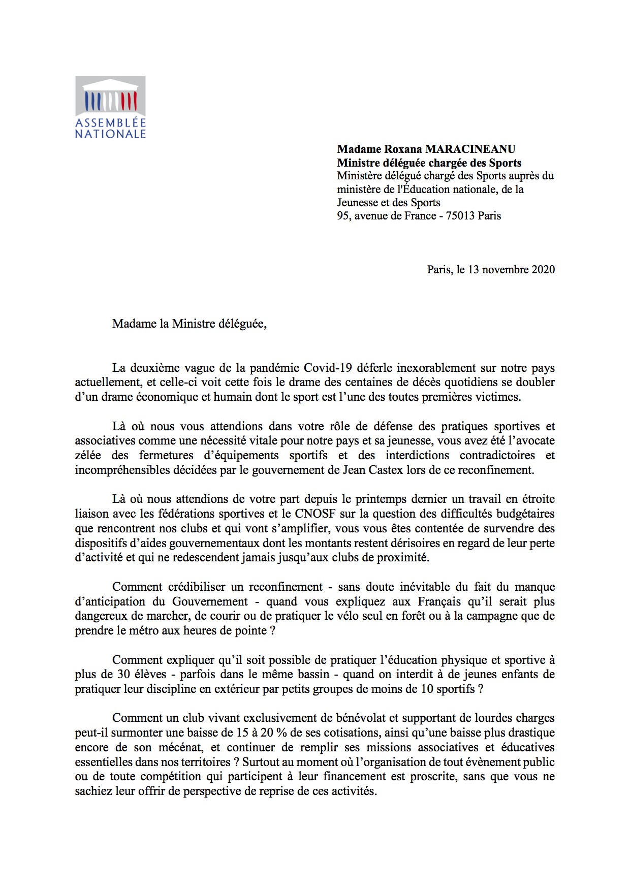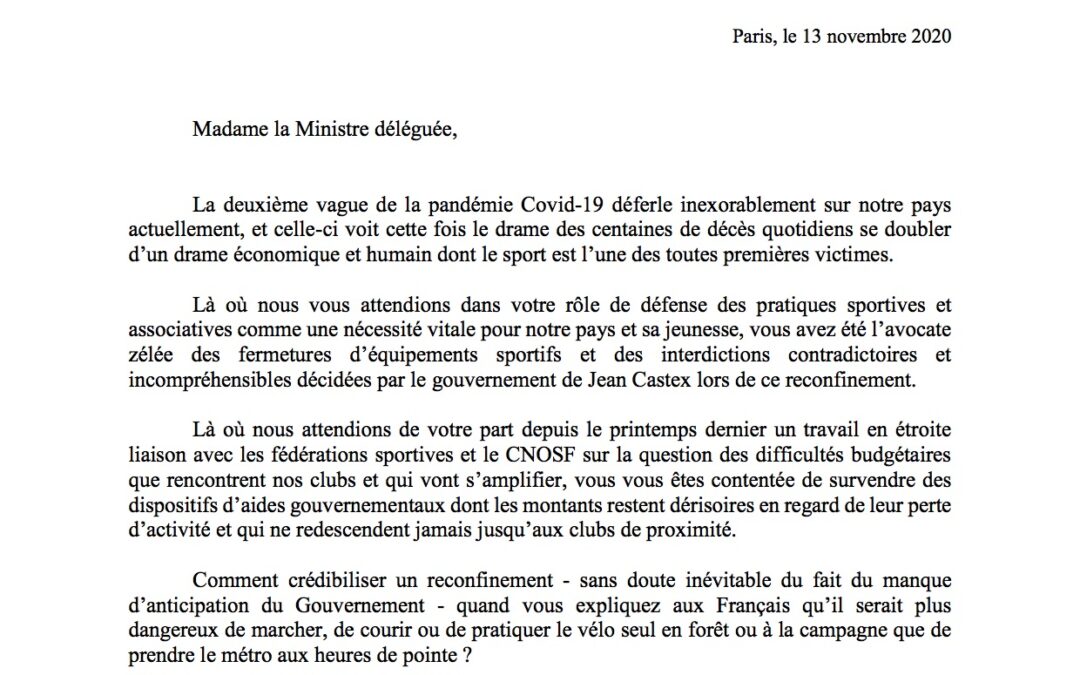 Courrier à la ministre déléguée chargée des Sports