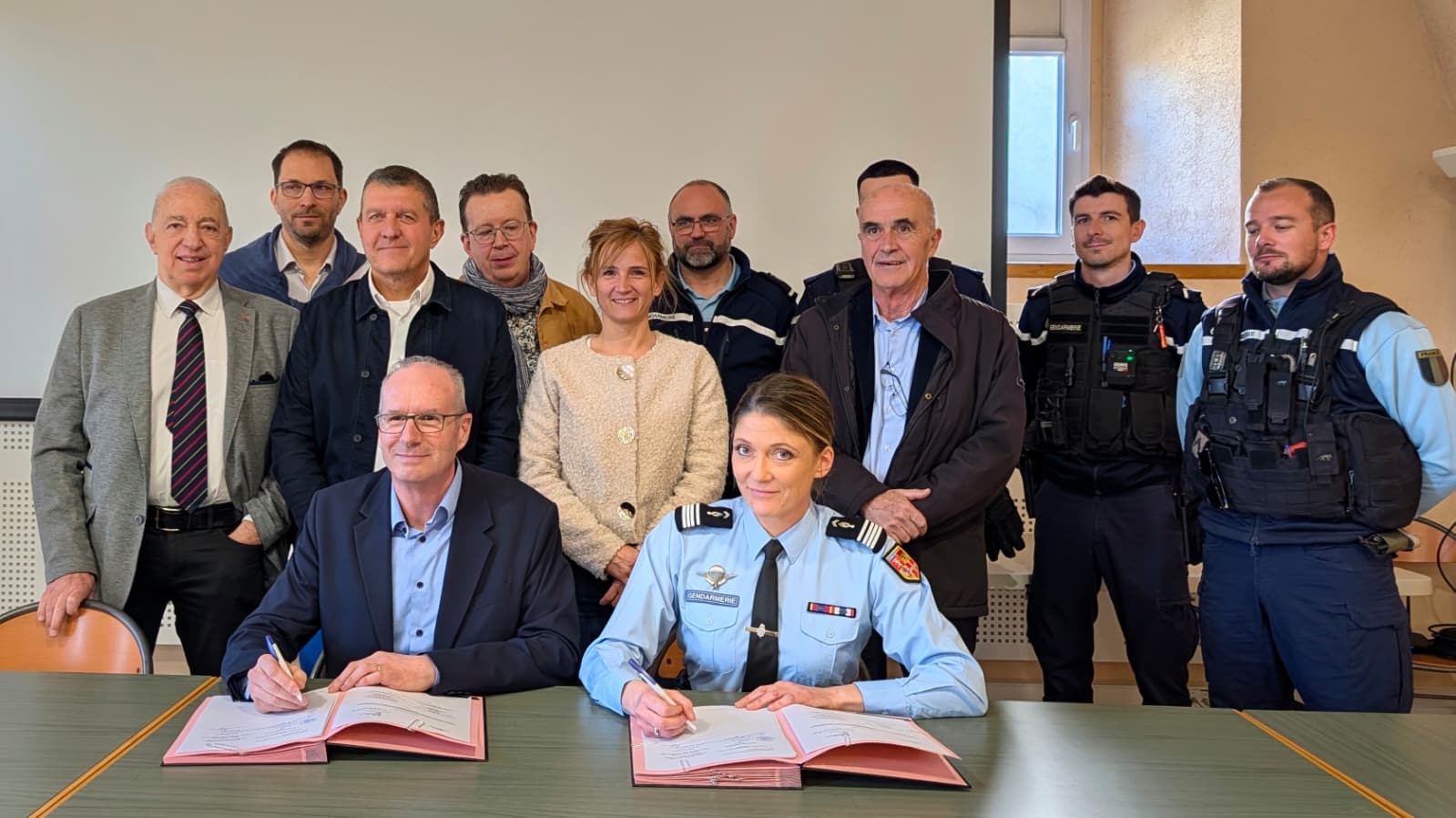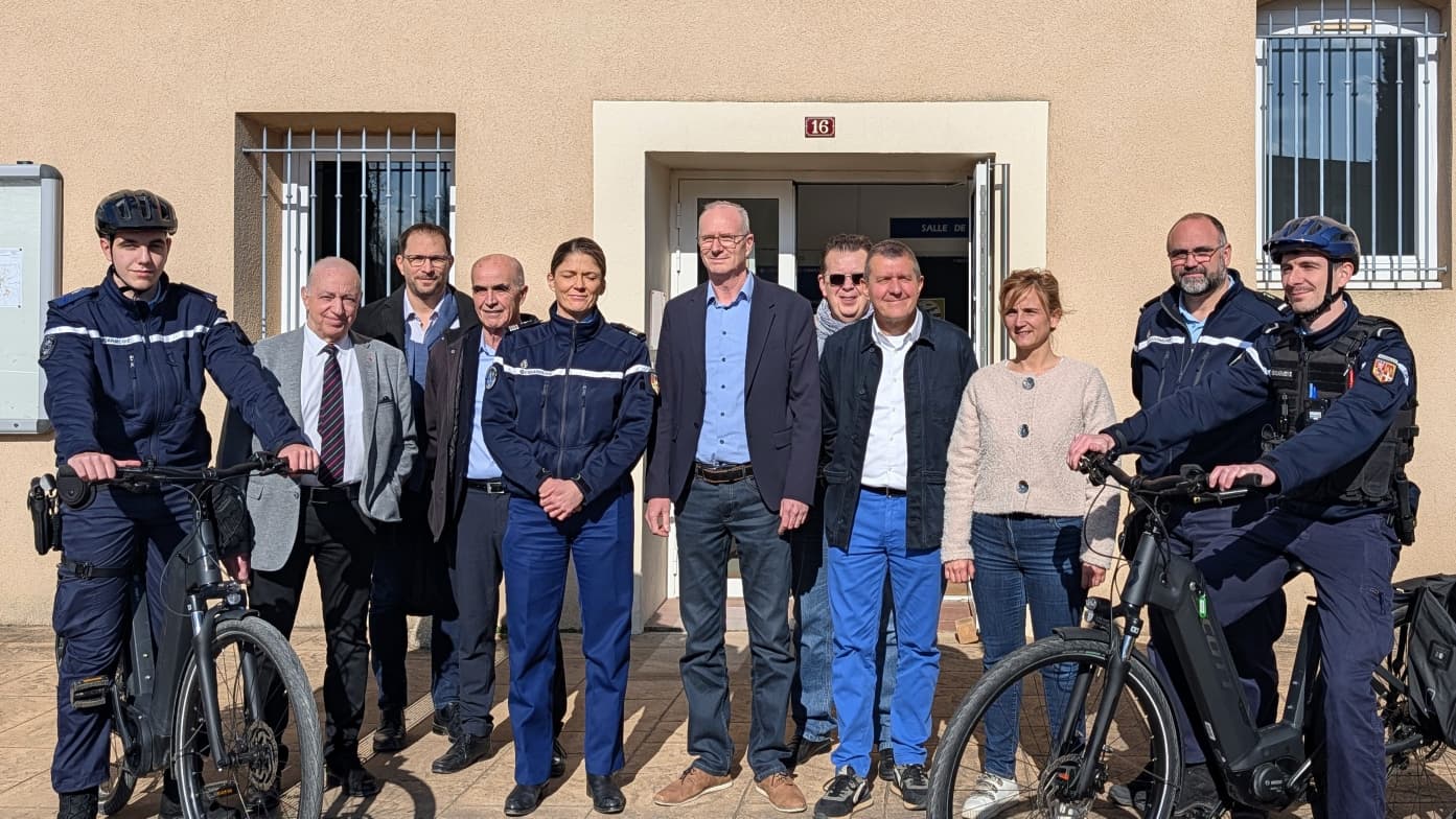 - à Ucel, avec la commandante Anika Szczepanski et les gendarmes de la compagnie de Largentière pour la remise de Vélos à Assistance Électrique (VAE) par la Communauté de Communes du Bassin d’Aubenas à la Gendarmerie de l’Ardèche pour renforcer les patrouilles de proximité.