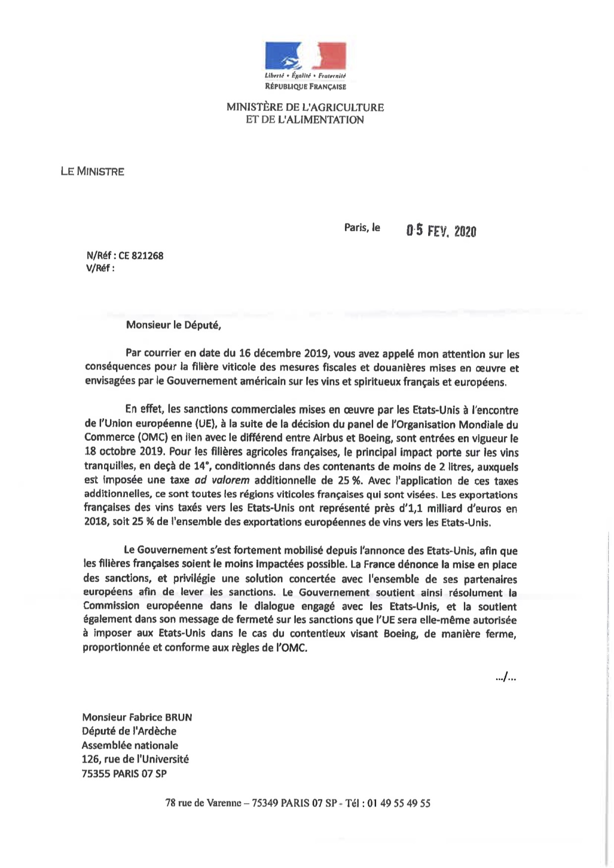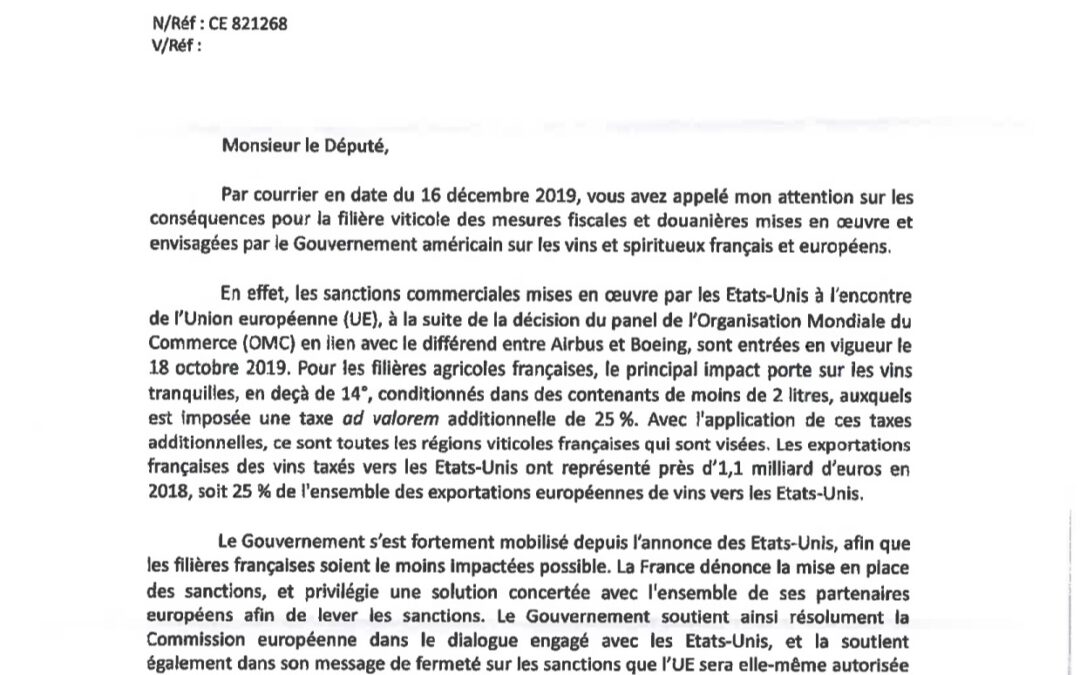 Let réponse Ministre agric (mesures fiscales douanieres) 5 fév 20