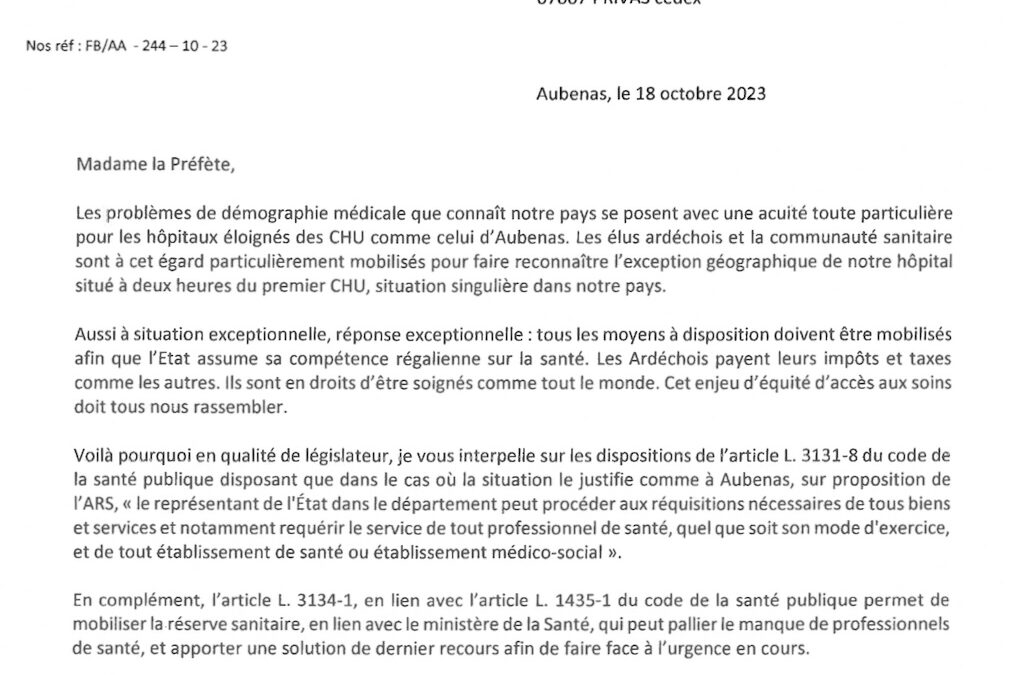 Courrier Préfète de l’Ardèche pour l’hôpital d’Aubenas