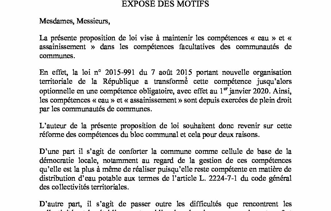 PROPOSITION DE LOI visant au maintien des compétences « eau » et « assainissement » dans les compétences facultatives des communautés de communes et des communautés d’agglomération (1)
