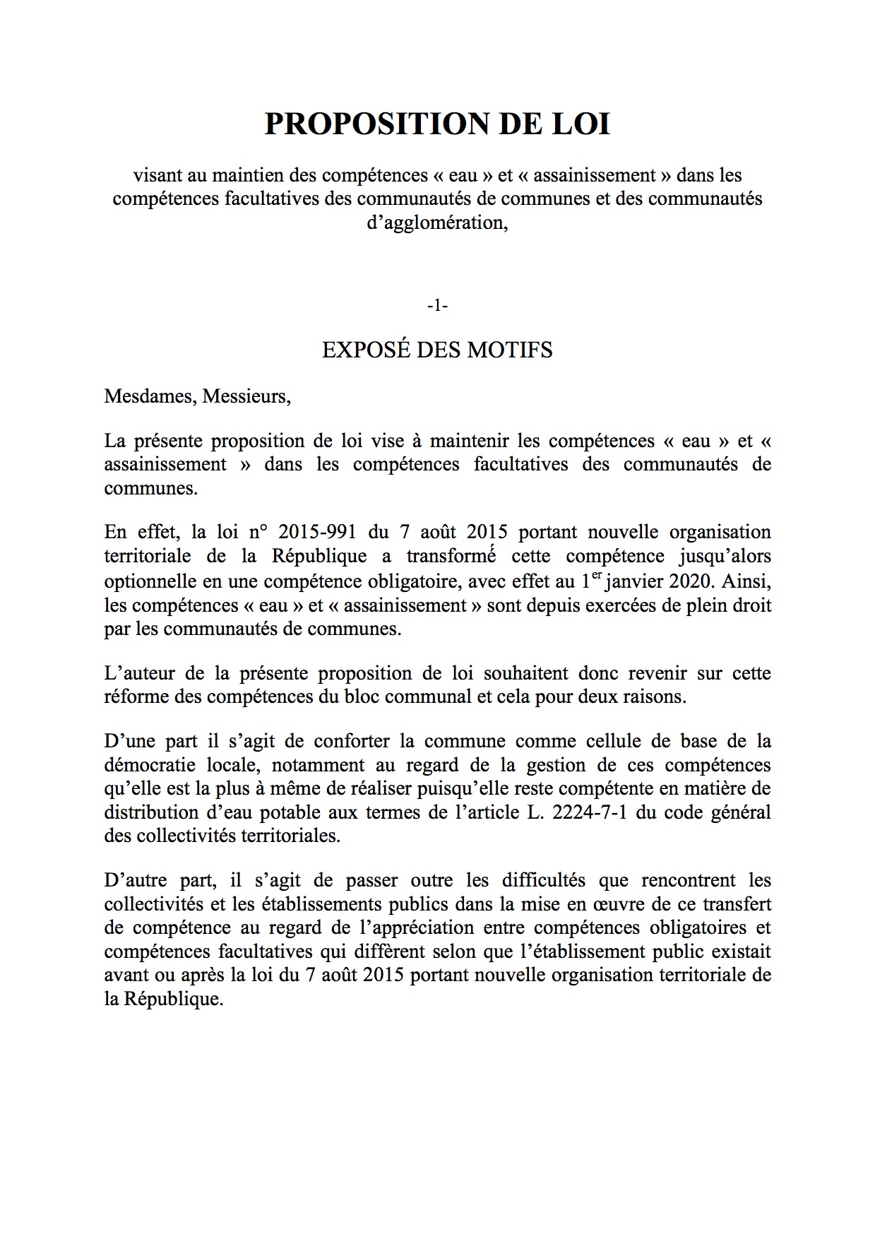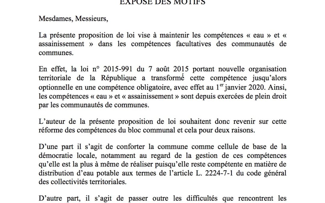 PROPOSITION DE LOI visant au maintien des compétences « eau » et « assainissement » dans les compétences facultatives des communautés de communes et des communautés d’agglomération (1)